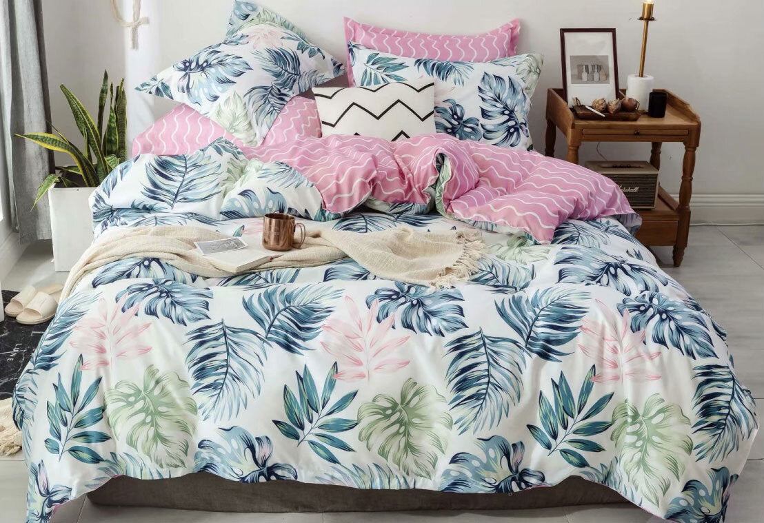 Ethel Quilt Cover Set / Doona Cover Set from Luxton Print Collection. It features an increditable design of tropical plant with green, pink, blue, and white mixed for a classic look and feel. Offering a cosy and natural style of your bedroom.